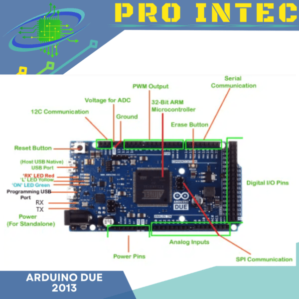 El Arduino Due posee 54 pines digitales de entrada y salida (de los cuales 12 pueden ser usados como salidas PWM), 12 entradas análogas, 2 salidas análogas, 4 UART (puertas seriales por hardware), cristal oscilador de 84MHz, una conexión compatible con USB-OTG, 2 TWI, Jack de poder, conexión JTAG, botón reset y un botón borrar. También tiene otras geniales funcionalidades como audio, DMA, una librería experimental para multitareas y más.